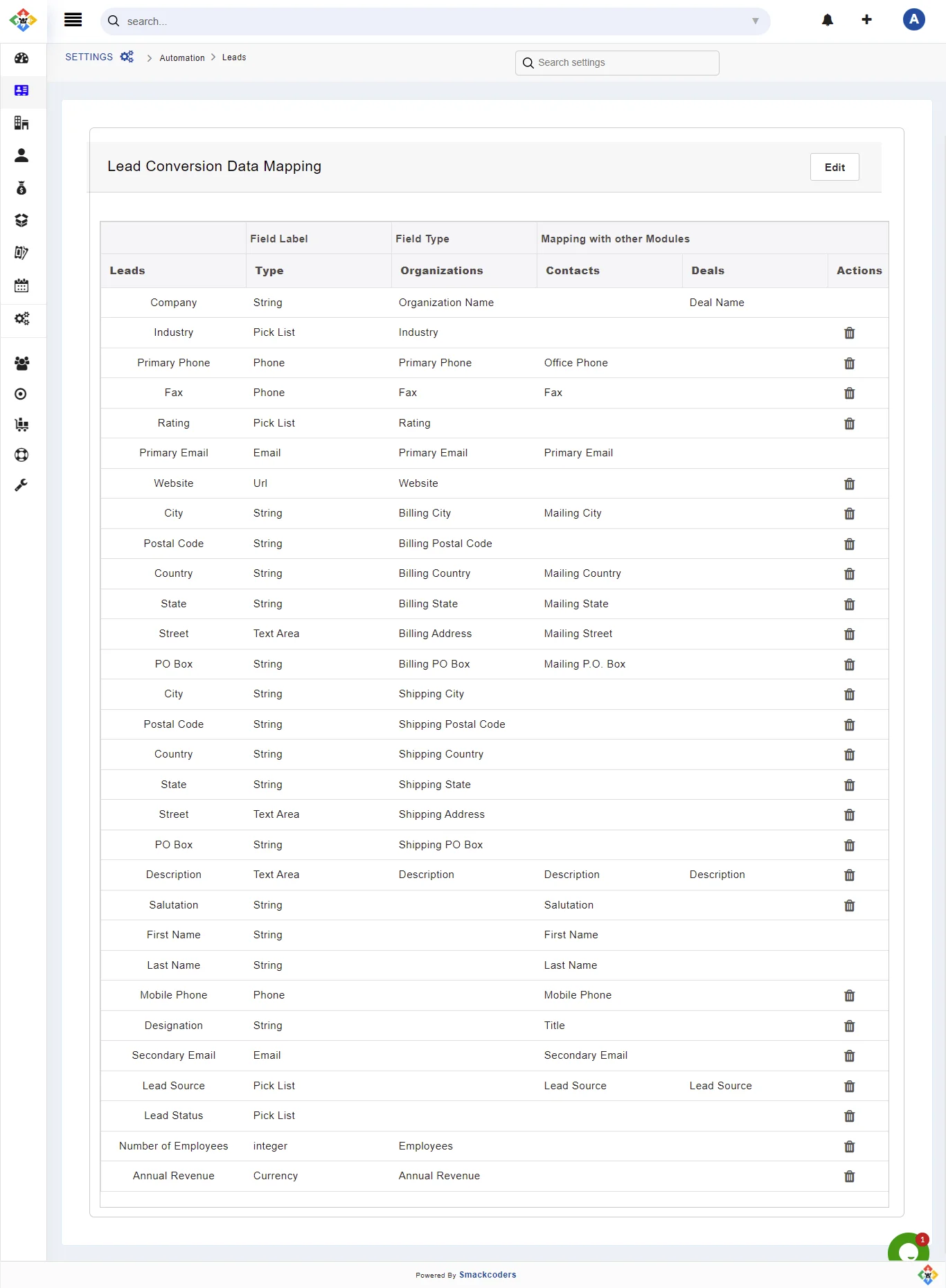 - Navigate to Left SideBar → Settings → Navigate to the Automation section → Lead Conversion Data Mapping